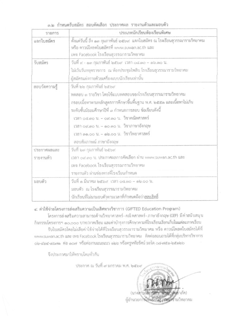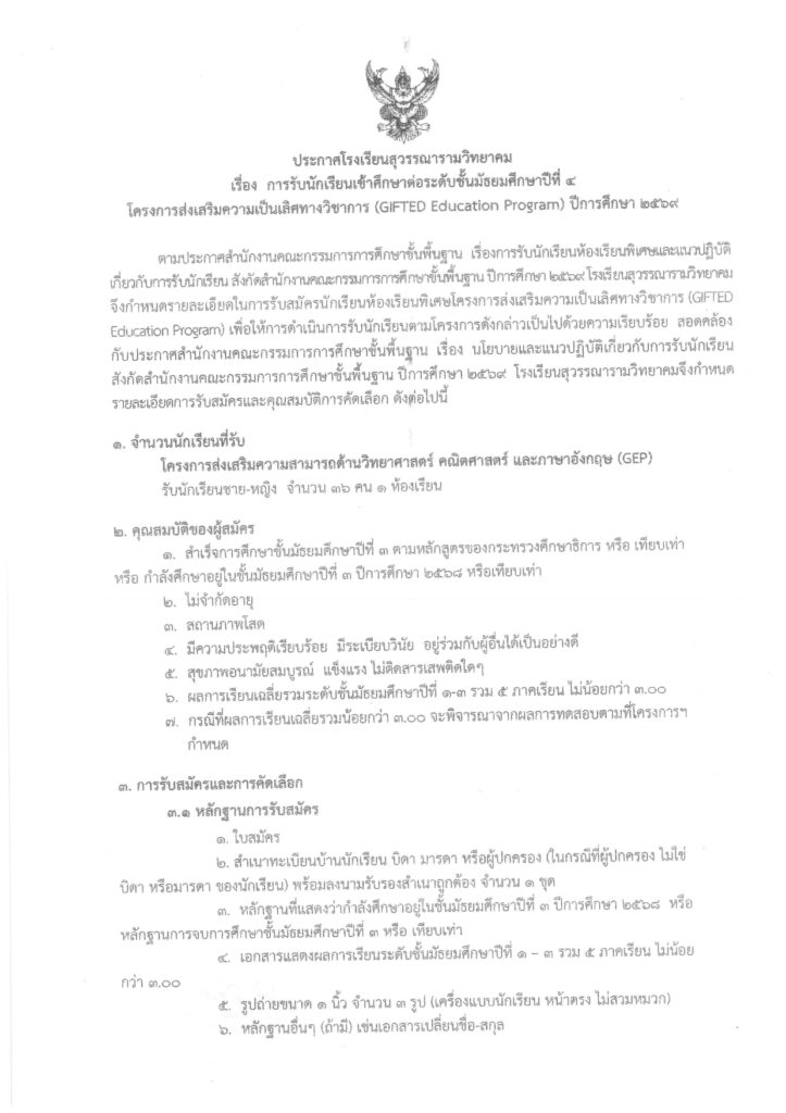 ข่าวประชาสัมพันธ์ ประกาศโรงเรียนสุวรรณารามวิทยาคม เรื่อง ประกาศการรับนักเรียนเข้าศึกษาต่อชั้นมัธยมศึกษาปีที่ 4 ห้องเรียนโครงการส่งเสริมความเป็นเลิศทางวิชาการ (GEP) ปีการศึกษา 2569 27 February 2026 admin